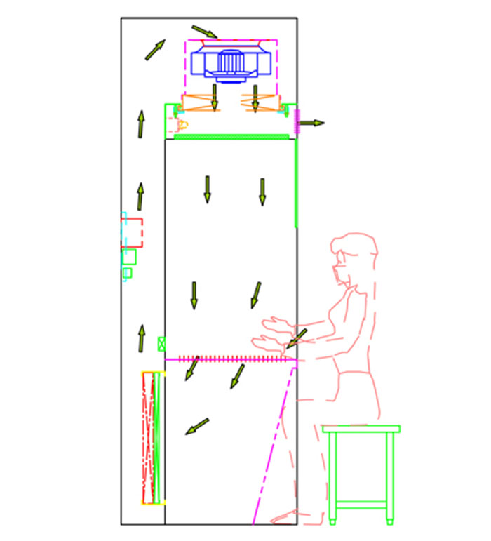 稱量亭潔凈氣流被送至送風箱體內(nèi),90%通過均流送風網(wǎng)板,形成均勻的垂直送風氣流,10%則通過風量調(diào)節(jié)板,排出設(shè)備。所有氣流均經(jīng)過高效過濾器處理,所以送風,排風均不帶殘余粉塵,避免了二次污染。